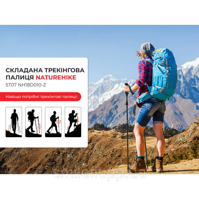 Naturehike ST07 NH18D010-Z — це трекінгові палиці, призначені для підтримки балансу та стійкості користувача під час туристичних походів і гірських сходжень. Аксесуари мають регульовану довжину від 99 до 115 см, що дозволяє адаптувати їх під індивідуальні уподобання та тип маршруту. Фіксація сегментів на потрібній висоті здійснюється за допомогою замків.