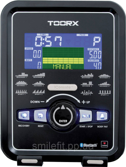 Велоергометр Toorx Upright Bike BRX 300 ERGO (BRX-300ERGO) із преміальної лінійки Chrono Line від італійського виробника Garlando S.p.A. призначений для комфортного кардіотренування в домашніх умовах. Тренажер має 32 рівня навантаження, що регулюються за допомогою сучасного комп'ютера. 16-кілограмовий маховик створює чудову плавність ходу, знижуючи навантаження на суглоби та мінімізуючи ризик отримання травми в процесі занять. Велоергометр розрахований на вагу до 150 кг і підійде для користувачів зростом до 2 м. Вбудований приймач для бездротового датчика вимірювання пульсу буде доречним під час тренування по одній із чотирьох пульсозалежних програм. Консоль тренажера має підставку для смартфона/планшета та підтримує Bluetooth для інтеграції з популярними програмами iConsole+ Training, Kinomap і Zwift, які перетворять монотонне тренування в захоплюючий процес. Сидіння велоергометра регулюється по висоті та в горизонтальній площині для індивідуального налаштування, а транспортувальні ролики в передній частині тренажера дозволяють переміщати його по кімнаті. Клас тренажера: Home line (для домашнього використання) Особливості: Електромагнітна гальмівна система з комп'ютерним регулюванням навантаження. Масивний маховик вагою 16 кг забезпечує чудову плавність ходу. Консоль має РК-дисплей із багатобарвним підсвічуванням, підставку для смартфона/планшета. 21 програма та 32 рівні навантаження для повноцінного кардіотренування. Bluetooth для інтеграції з iConsole+ Training, Kinomap і Zwift. Відстань від педалей до сидіння становить від 71,5 до 98 см. iConsole+ Training - додаток нового покоління для iConsole. Він надає більш детальні дані про тренування, більш простий режим навчання та інтегроване з BLE Heart Rate Monitor. Цей додаток працює з сумісними велотренажерами, орбітреками та біговими доріжками з вбудованим приймачем Bluetooth Low Energy. Тренуйтеся разом з iConsole і насолоджуйтесь кожного разу. Завантажте додаток Kinomap, увімкніть свій пристрій, і Вам буде доступно 300 000 км геолокалізованих відео, зареєстрованих по всьому світу. Киньте виклик своїм друзям, змагайтеся з іншими користувачами або тренуйтеся наодинці, щоб побити свої рекорди. Завдяки більш ніж 15 новим функціям, додаток для тренувань має зовсім новий вигляд, який відповідає потребам користувача, включаючи кадри з реального життя для тренувань у приміщенні. Додаток Kinomap також включає навчальний відеоконтент, абсолютно новий ігровий процес через публічні та приватні перегони. Ніколи ще тренування не було таким захоплюючим: швидкість відео синхронізується з ритмом Вашого руху. Ви готові розпочати Досліджуйте кожен куточок світу, обмінюйтесь коментарями у соціальних мережах та порівнюйте свої результати. Завантажте Zwift - безкоштовний додаток для бігу та тренувань із Вашою спільнотою. Тренуйтесь весело разом зі світовою спільнотою крізь захоплюючі локації, тренуйтеся вдень і вночі, в дощ чи спеку, з будь-якої точки світу абсолютно безкоштовно. Наші елітні тренери створюють вправи, щоб зробити Вас спортсменом, яким Ви хочете стати. Програми підбираються відповідно до рівня Вашої фізичної підготовки, і їх легко виконувати, що полегшує тренування та робить його веселим. Незалежно від того, чи готуєтеся Ви до забігу на 5 кілометрів, напівмарафону чи тріатлону, Ваші потреби в тренуваннях будуть враховані. Займайтесь самостійно або приєднуйтесь до групових тренувань і 