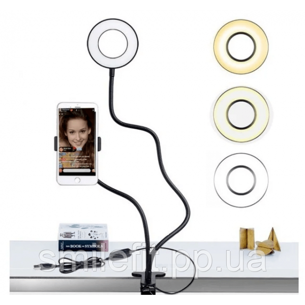 Зручна річ для тих, кому соціальні мережі приносять дохід і популярність, компактна гнучка лампа з власником для телефону не тільки висвітлить зйомку, а й звільнить руки від телефону, а універсальна прищіпка дасть можливість встановити кільцеве світло де завгодно.