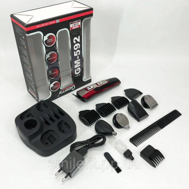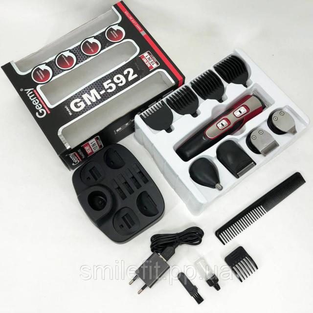GEMEI GM-592 9 в 1 чудовий подарунок для сучасного чоловіка, який стежить за своєю зовнішністю та любить у всьому акуратність та організованість. На цільній підставці грамотно розташована сама машинка GEMEI GM-592 та супутні аксесуари. Кожна з наявних з десяти насадок у наборі має своє строге призначення, завдяки цьому комплекту чоловік може підтримувати в ідеальному стані свої вуса і бороду, регулювати довжину волосся, що зістригається, а також делікатно позбавлятися зайвого волосся в носі і вухах.