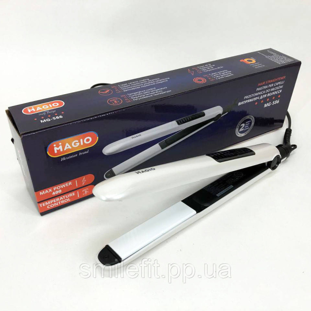 Випрямляч для волосся Magio MG-586 – має дві ключові особливості – це зручність та елегантність. Модель виконана у надзвичайно стильному корпусі та має легку вагу. Матеріал поверхні робочих пластин – двошарова кераміка, яка позитивно впливає не лише на кінцевий результат зачіски, а й на здоров’я волосся. Плаваюча пластина дуже знижує ризик пошкодження волосся. Максимальна потужність приладу – 40 Вт, що сприяє швидкому нагріву приладу. А за допомогою електронного типу управління, можна вибрати оптимальну температуру для різних типів волосся. Петелька для підвішування та блокування ручки створюють додаткову зручність при використанні.