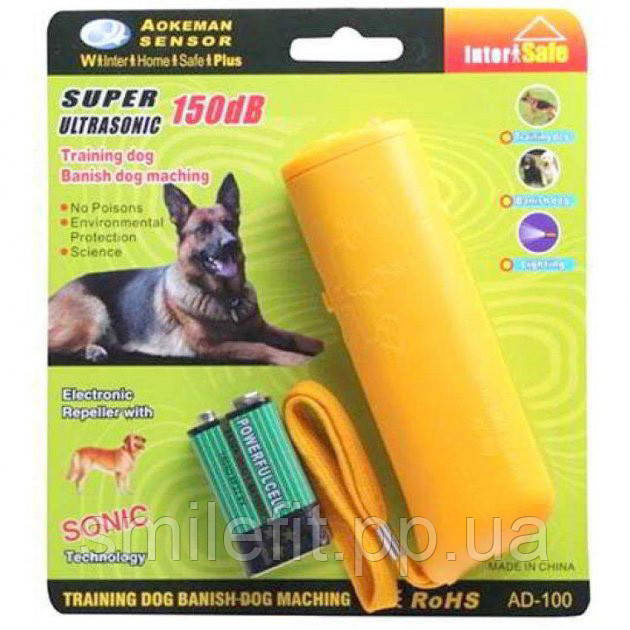 Мініатюрний відлякувач собак AD-100 являє собою електронний прилад, що носиться (зібраний в корпусі мініфонарика), що випромінює потужні ультразвукові коливання, що чують собаки і не сприймаються людиною. Випромінювання зупиняє агресивного собаку і звертає його втечу. Прилад особливо дієвий, якщо собака звернена у Ваш бік і поводиться загрозливо. Ультразвук не завдає собаці фізичної шкоди, а лише змушує її відчути сильний дискомфорт, панічний страх та бажання втекти. Найбільший ефект досягається при дії на агресивних бродячих собак.