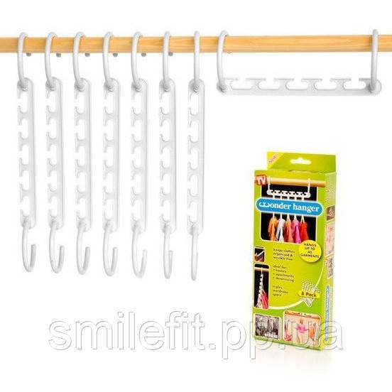 Речі надійно утримуються затискачами, спідниці вішаються на спеціальні петлі. Універсальна вішалка вимагає мінімум місця у шафі та при транспортуванні. В одному наборі міститься вісім вішалок. Кожна вішалка має п’ять невеликих перекладин. Щоб розмістити одяг на Wonder Hanger, необхідно висунути поперечину.