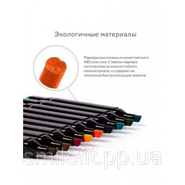 У наборі 80 маркерів різних кольорів. Корпус пластиковий гладкий. Ковпачки щільно закриваються. Для зручності розпізнавання типу пера кінці маркерів пофарбовані різним кольором. Кожний колір має свій цифровий код, який нанесений на ковпачок маркера. Чорнила на спиртовій основі добре вбираються в папір, тому рекомендується використовувати щільні листи або картон. ; Кольори добре змішуються між собою, перехід відтінків плавний.