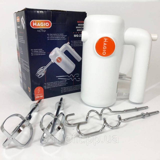 Зручний міксер MG-232 дозволить замішувати різні продукти, використовуючи насадки, що додаються. Це може бути як тісто різної щільності, так і суміші для коктейлів, мусів та кремів.