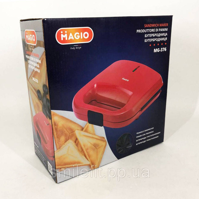 Бутербродниця MG-376 володіє всіма необхідними функціями для того, щоб швидко приготувати смачні та поживні сендвічі. Одночасно в ній можна випікати відразу по 4 сендвічі, краї яких щільно спаюють борти форм, надійно замикаючи начинку всередині. Корпус виготовлений із висококласного термостійкого пластику червоного кольору. Тип листа – підсмажений бутерброд у формі трикутників. Нагрівальний елемент потужністю 750 Вт забезпечить швидке і рівномірне нагрівання двох робочих поверхонь з антипригарним покриттям. Бутербродниці Magio дуже зручні в користуванні, сендвічі не пригорають і легко витягуються. Завдяки компактним розмірам та фіксатору бутербродницю зручно зберігати. На кришці є світлові індикатори живлення та готовності до роботи, що полегшує контроль процесу приготування.