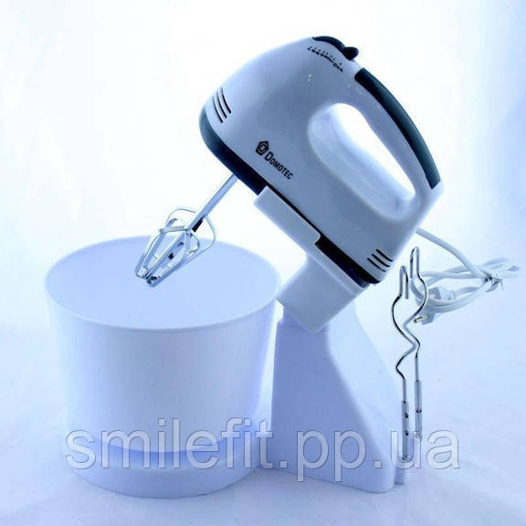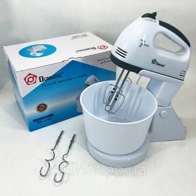 Міксер з чашею Domotec MS 1366 – дуже зручний, легкий у використанні та очищенні. Корпус міксера підставка та чаша виготовлені із пластику, а насадки з нержавіючої сталі, продумана до дрібниць ергономіка надає додаткового комфорту у використанні даного міксера. MS 1366 має 7 швидкісних режимів роботи для збивання продуктів різної густини, його потужність дозволяє легко збивати яйця, соуси або бісквітне тісто. У комплекті Domotec MS-1366 є велика чаша, на яку легко встановлюється міксер, тим самим перетворюючи його на стаціонарний прилад, що дозволяє звільнити руки на кухні. Також є два віночки для збивання і додаткові гаки для замішування тіста, що оцінять господині, які люблять радувати свою сім’ю різною випічкою.