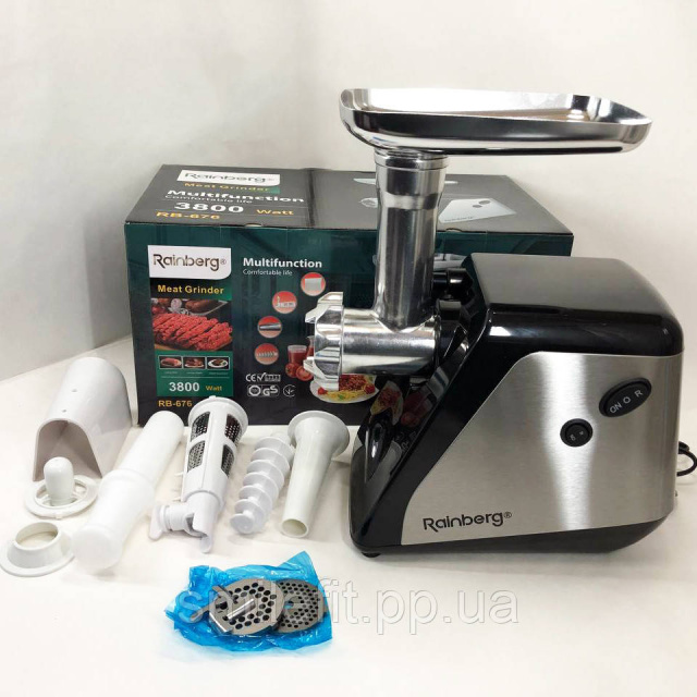 Електрична м’ясорубка Rainberg RB-676 | 3800W призначена для виготовлення фаршу з м’яса, риби, грибів, нарізки овочів та фруктів....
