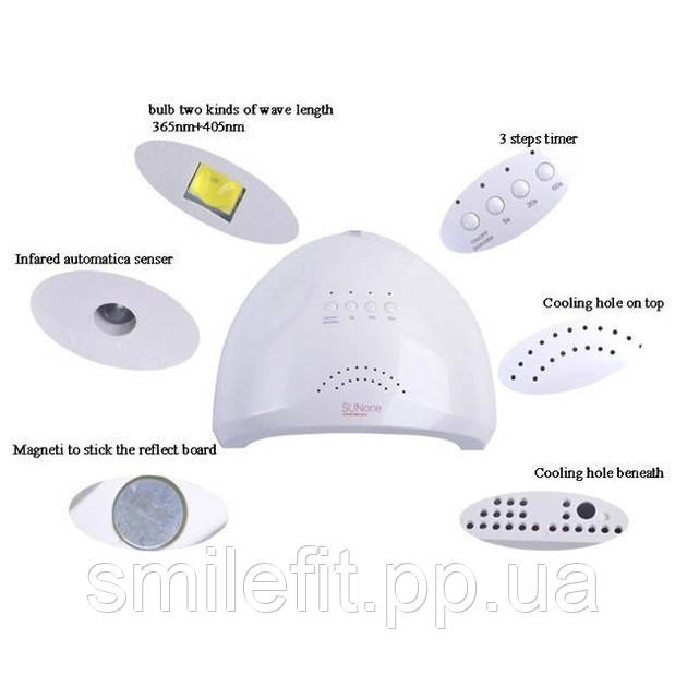 LED лампа SUNone – універсальний, потужний прилад для полімеризації. Тепер немає необхідності купувати кілька ламп, які сушать різний матеріал із різною швидкістю. SUNone – лампа нового покоління, яка здатна сушити як LED гелі і гель-лаки, так і UV матеріали для нарощування нігтів. Лампа Sun One потужністю 48w з 30 світлодіодними лампочками використовується в манікюрному сервісі для домашнього