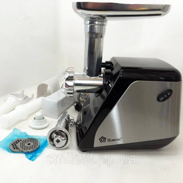 Електрична м’ясорубка з функцією соковижималки Domotec MS-2024 з насадкою для томатів і двома функціями подрібнення, нарізки та нарізки скибочками. М’ясорубка Домотек призначена для виготовлення фаршу з м’яса, риби, грибів, нарізки овочів та фруктів, профілювання пісочного та пельменного тіста. Електром’ясорубка з функцією соковижималки шнекового типу має функцію реверс, зворотне обертання ножів, що запобігає ущільненню продуктів усередині м’ясорубки та забезпечує якісне подрібнення.