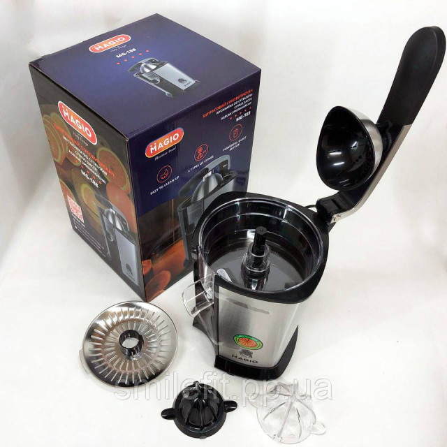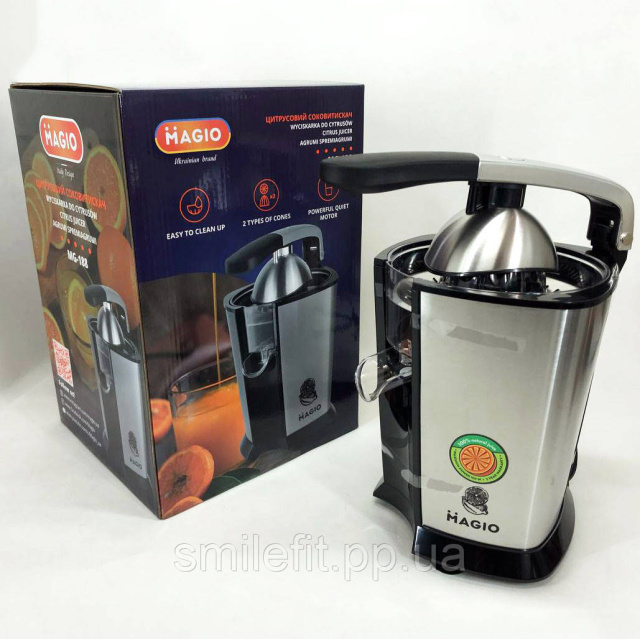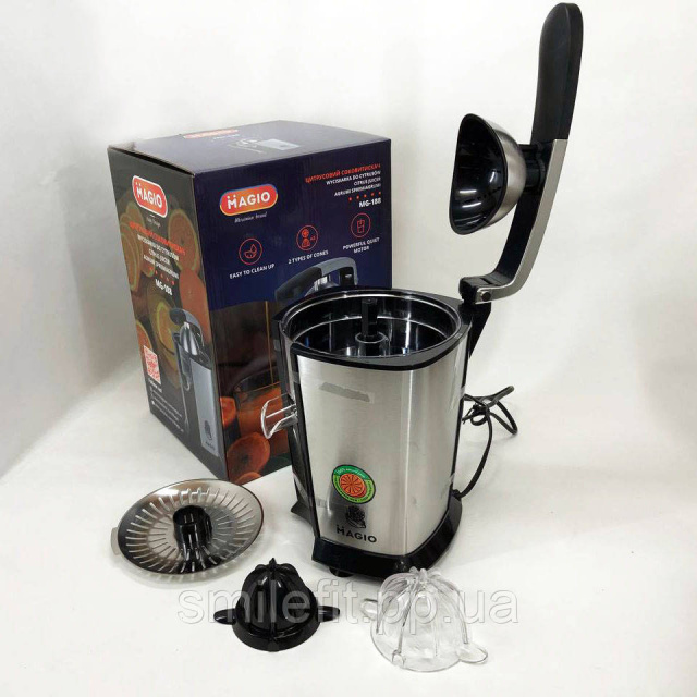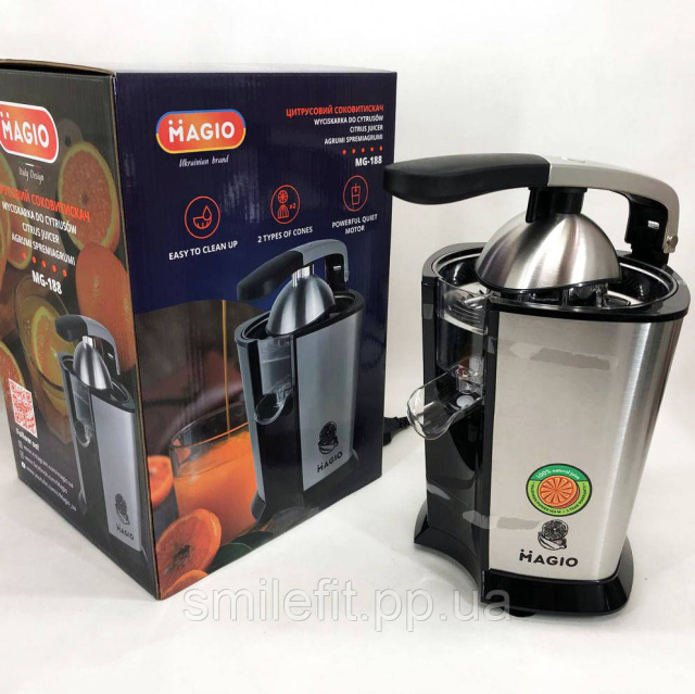 Універсальний соковитискач Magio MG-188— це поєднання ультрамодного дизайну та найвищої якості виконання. Даний варіант соковижималки конструкційно призначений саме для цитрусових — ніякі інші прилади так добре не впораються із відділенням соку від м’якоті у цих фруктів. Максимальна потужність 150 Вт, два конуси для будь-яких видів цитрусових та зручна ручка допоможуть Вам отримати максимальну кількість соку за один раз.