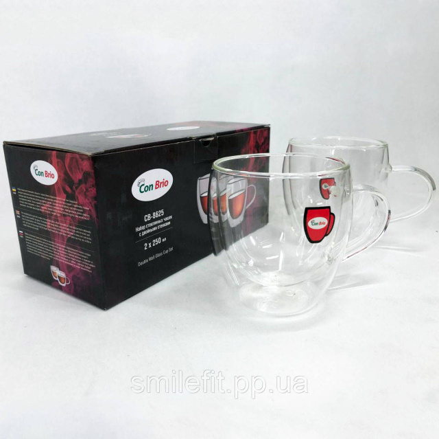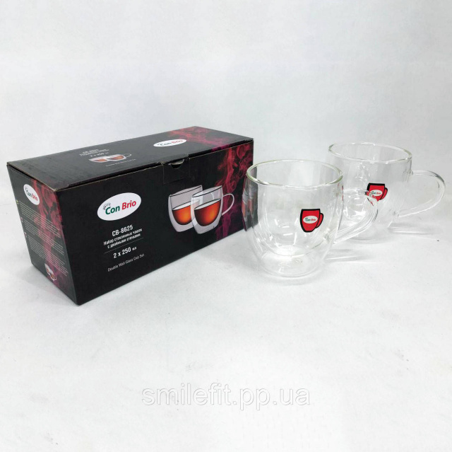 Набір чашок з подвійним дном Con Brio виготовлений зі скла. Зручні, місткі чашки незамінні будинки і на робочому столі в офісі. Можна мити в посудомийній машині. Також ідеально підійдуть для домашнього використання.