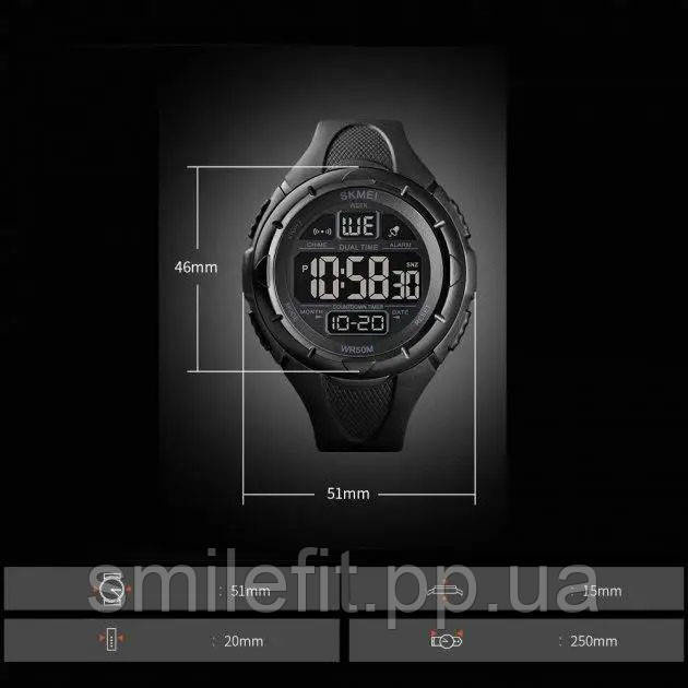 SKMEI 1656BK оснащений усіма необхідними функціями для вашого комфорту: подвійний час, секундомір, будильник, таймер зворотного відліку, підсвітка, індикація дати та дня тижня. Завдяки водонепроникності до 50 метрів, годинник не боїться дощу, миття рук та інших повсякденних ситуацій з водою.