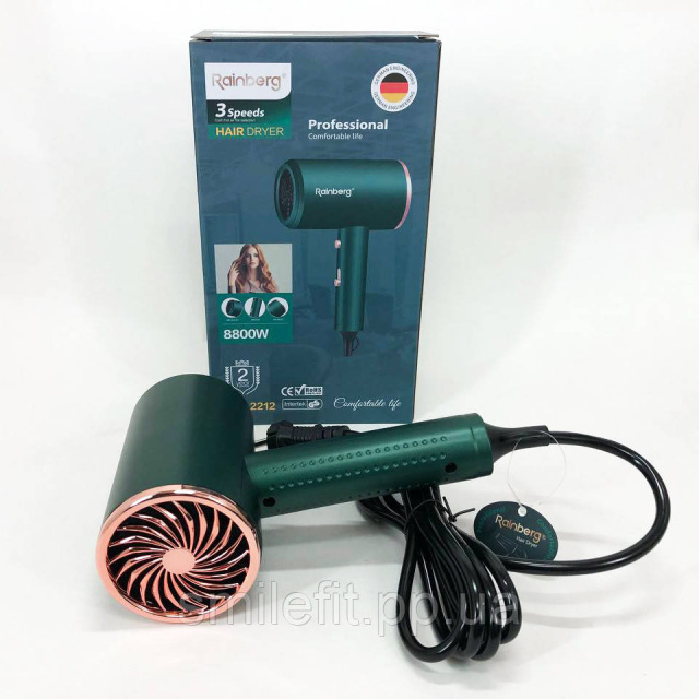 Фен Rainberg RB-2212 8800 W з регуляцією температури та швидкості для сушіння та укладання волосся. Колір: зелений, Київ
