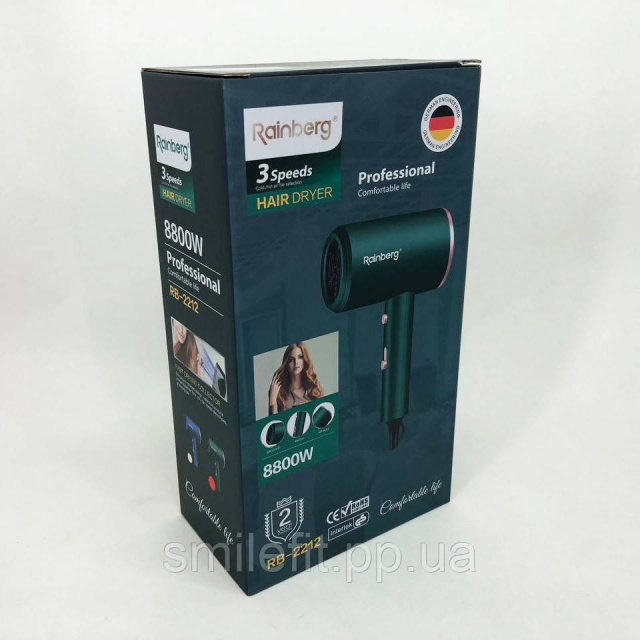 Rainberg RB-2212 – це зручний та функціональний фен, який відрізняється своїм дизайном, доступною ціною та при цьому великим набором функцій. Відрізняється своєю якістю, надійністю, дбайливо сушить волосся. Має три швидкості та можливість холодного обдування.