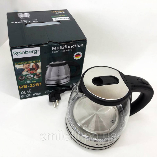 Скляний з підсвічуванням електричний чайник rainberg RB-2251 з дисковим нагрівальним елементом відмінно впишеться в інтер’єр вашої кухні, порадує гарним дизайном та простотою використання.