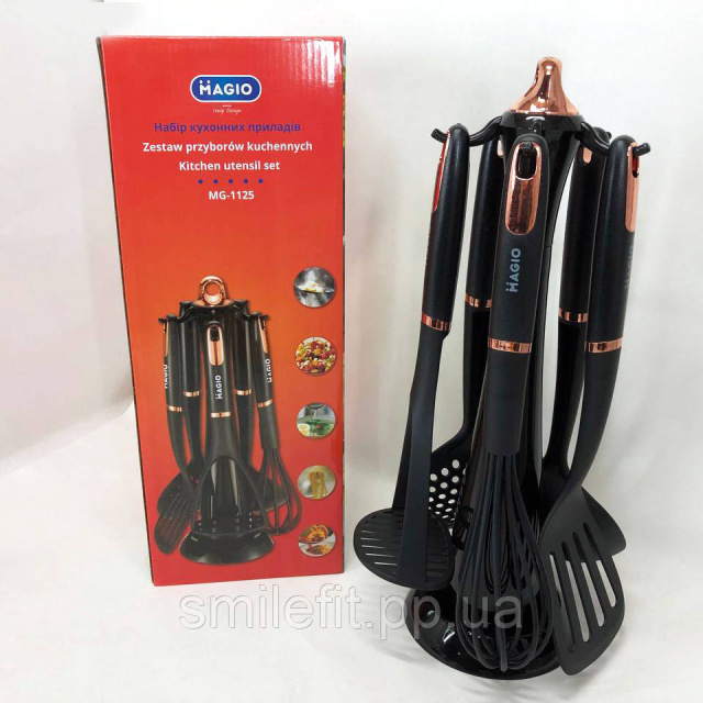 Набір кухонний MG-1125 — практичне приладдя з пластику та нейлону. Ідеально підходить для всіх ваших повсякденних кулінарних потреб. Завдяки підставці можна легко зберігати їх на кухонній стільниці.