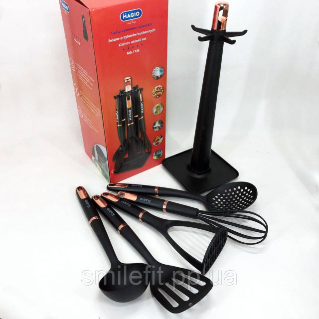 Набір кухонний MG-1126 — практичне приладдя з пластику та нейлону. Ідеально підходить для всіх ваших повсякденних кулінарних потреб. Завдяки підставці можна легко зберігати їх на кухонній стільниці.