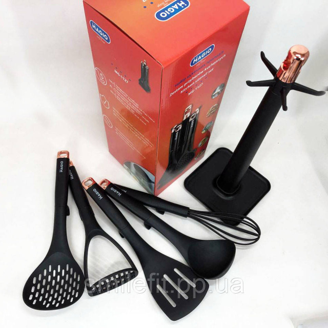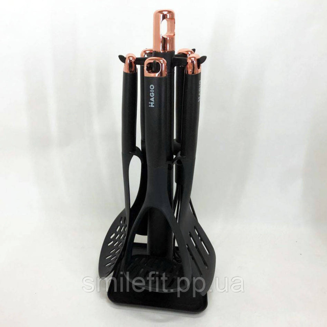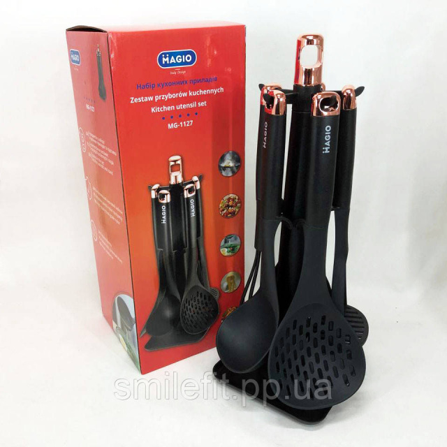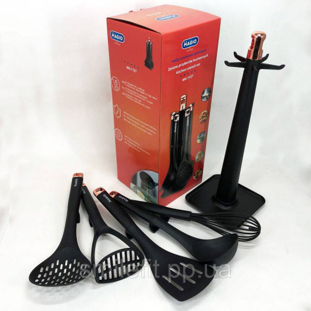 Набір кухонний MG-1127 — практичне приладдя з пластику та нейлону. Ідеально підходить для всіх ваших повсякденних кулінарних потреб. Завдяки підставці можна легко зберігати їх на кухонній стільниці.