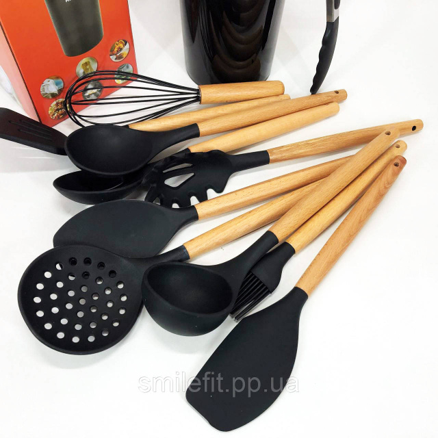 Матеріал виготовлення – силікон, який робить вироби стійкими до впливу високих температур та запобігає пошкодженню поверхонь посуду. М’якість силікону забезпечує надійний захист антипригарного покриття каструль та сковорідок. Цей набір кухонних приладів дозволяє готувати з комфортом та легкістю, забезпечуючи відмінні результати у кулінарних експериментах.