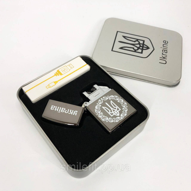 Цю дугову USB-запальничку “Україна” виконано в лаконічному, але виразному дизайні з патріотичним акцентом. Корпус прикрашений білим принтом герба України в обрамленні декоративного орнаменту, а на кришці вигравіруване слово “Україна”. Завдяки металевому корпусу з матовим покриттям, запальничка виглядає солідно та зручно лежить у руці.