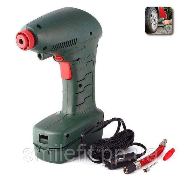 Автоматично зупиняється при заданому тиску; працює на 12V від прикурювача Вашого автомобіля