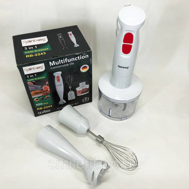 Потужності блендера в 500 Вт цілком достатньо для виконання всіх цих завдань із головою. Крім усього іншого варто згадати про те, що модель Rainberg RB RB-2243 – ndash; це комбінований кухонний прилад. Який завдяки своїй багатій комплектації може застосовуватися також для збивання яєчних білків, приготування майонезів, соусів і т.д, виконуючи по суті роль міксера завдяки насадці-віночку.