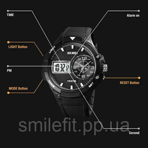 SKMEI 1761BKWT оснащений усіма необхідними функціями: будильник, секундомір, автоматичний календар, підсвітка, 12/24-годинний формат і подвійний час. Високий рівень водозахисту 10 ATM дозволяє не знімати годинник під час плавання або прийому душу. Це чудовий вибір для чоловіків, які шукають міцний і функціональний годинник із впізнаваним дизайном.