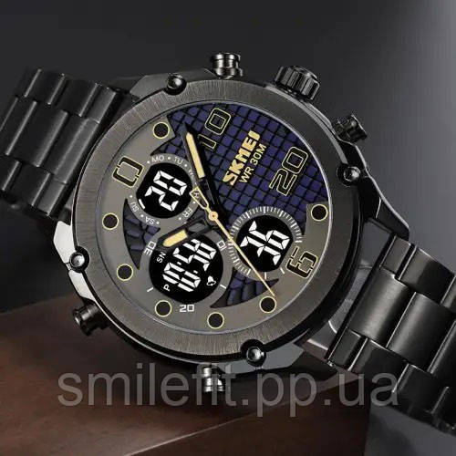 Годинник SKMEI 1975LBKBK — це вдала комбінація брутального дизайну та практичних можливостей. Його масивний корпус чорного кольору з сітчастим візерунком на циферблаті виглядає солідно та виразно. Цифрові дисплеї інтегровані в класичний аналоговий формат, що робить годинник не лише стильним, а й багатофункціональним. Ідеально пасує до повсякденного, міського або casual стилю.