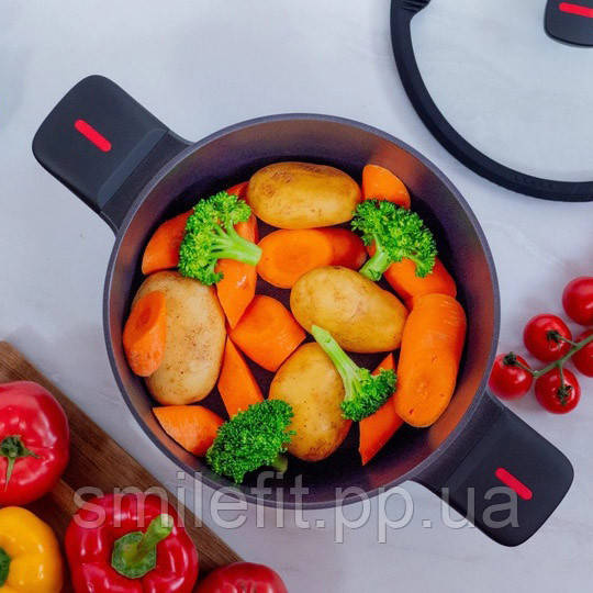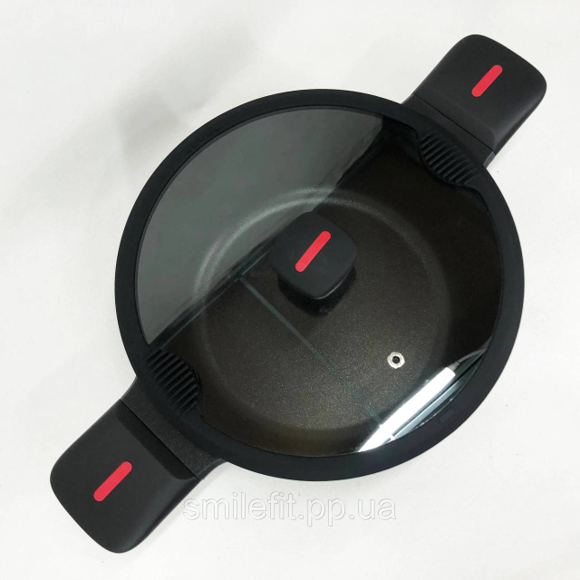 Кришка: Так, в комплекті, із загартованого скла, зі спеціальними отворами для виходу пари та зливу рідини; із силіконовим кільцем, що захищає від сколів та спеціальними силіконовими вставками, що захищають пальці від опіків