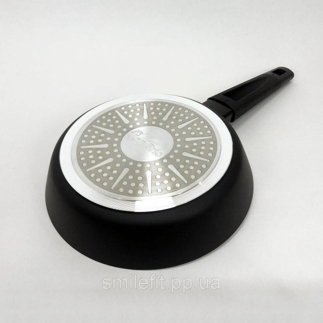 Потовщений алюмінієвий корпус виготовлений за технологією гарячого кування, що дозволяє рівномірніше розподіляти температуру по всій поверхні сковороди.