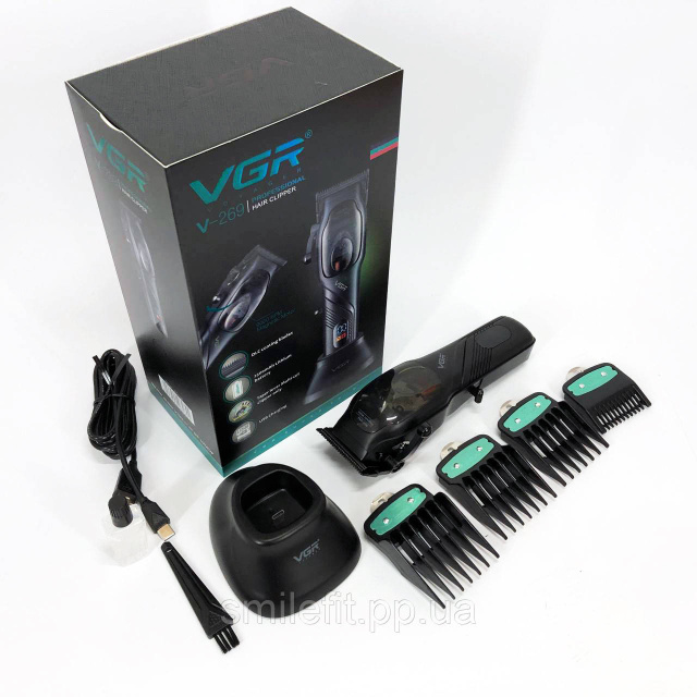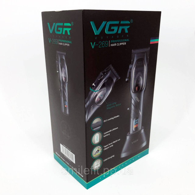 Знімний акумулятор великої ємності може бути безпосередньо заряджений за допомогою зарядного блоку адаптера, що додається. Акумуляторна машинка для стрижки волосся VGR V-269 відрізняється міцним корпусом, стійким до дії вібрації, низьким рівнем шуму, стильним дизайном, плавним ходом гострих лез, зручністю та тривалим терміном експлуатації.