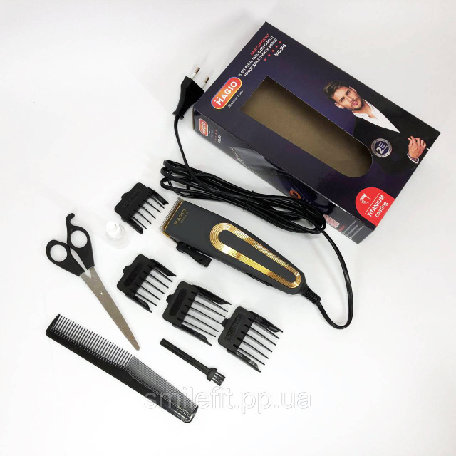 Машинка для стрижки волосся Magio (MG-593) обладнана потужним двигуном потужністю 25 Вт і працює з низьким рівнем шуму. Лезо з покриттям титану забезпечує довговічність і точність стрижки. В комплект входять 4 насадки (3 мм, 6 мм, 9 мм, 12 мм), гребінець, ножиці, масло та щітка для догляду за пристроєм.