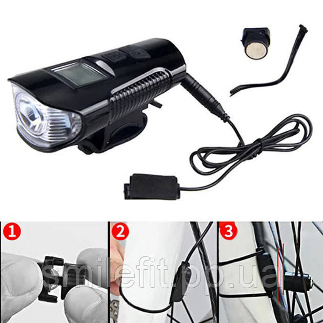 Велосипедний ліхтар зі світлодіодами Т6 з додатковою функцією велокомп’ютера, габаритними вогнями та велодзвінками. Забезпечує безпеку велосипедиста у темний час доби. Ліхтар оснащений вбудованим акумулятором, який можна зарядити від зарядного пристрою через порт microUSB. Водонепроникний, наявність індикації заряду. Дзвінок оснащений шістьма різними видами сигналу. Велокомп’ютер може надавати 5 видів інформації про подорож.