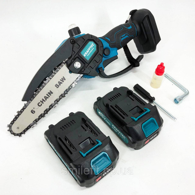 Особливості акумуляторної ручної ланцюгової пилки Krafftec ніяких токсичних вихлопів, тому працювати безпечно як на вулиці, так і в приміщенні;