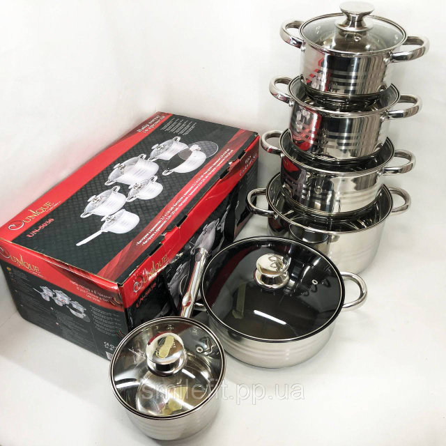 Набір каструль UNIQUE UN-5036 з індукційним дном 12 предметів (2.1 / 2.9 / 3.9 / 6.5 л + ківш 2.1 л + казан 4.5 л)