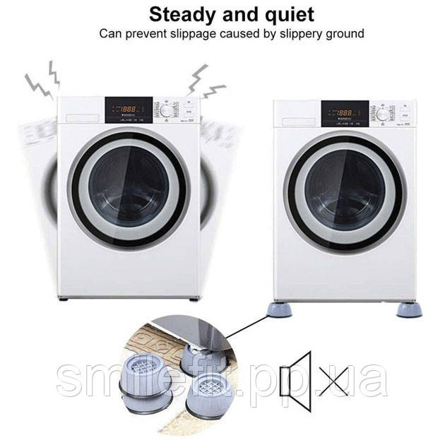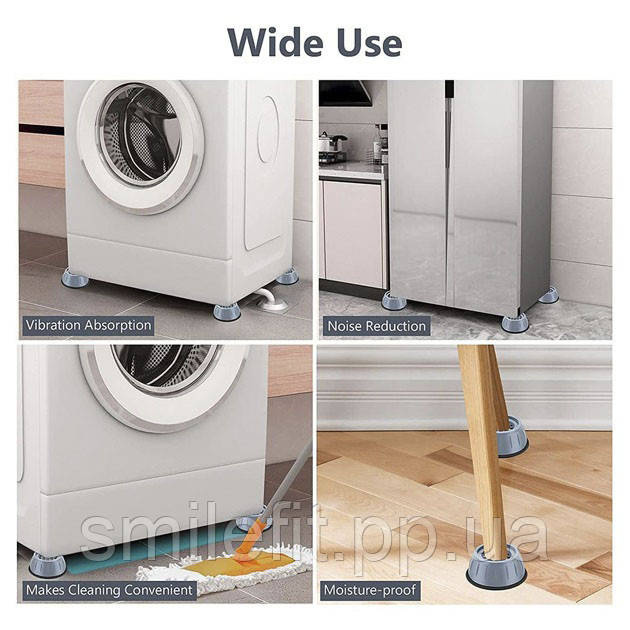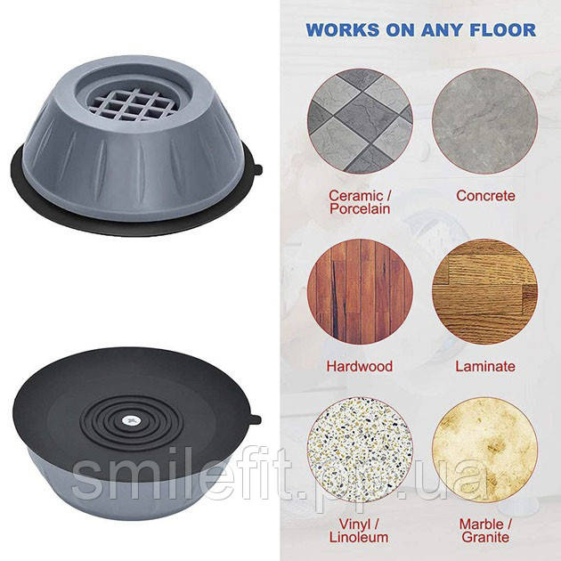Антивібраційні ніжки для пральної машини універсальні та підходять для всіх пральних та сушильних машин, холодильників, столів, диванів, ліжок та інших меблів, представленої на ринку. Чим рівніша поверхня, тим міцніше і стабільніше зчеплення.