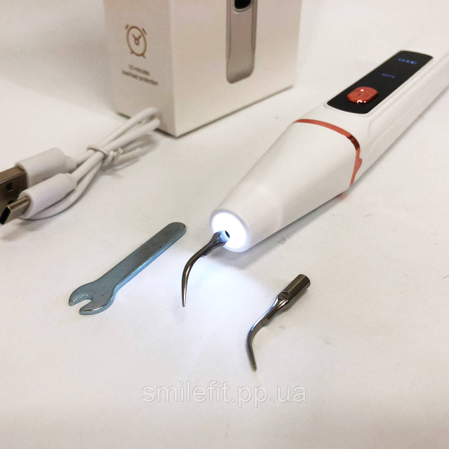 Комплектація: ультразвуковий скейлер, плоска і гостра чистячі головки, ріжковий ключ, USB кабель Type-C, посібник користувача