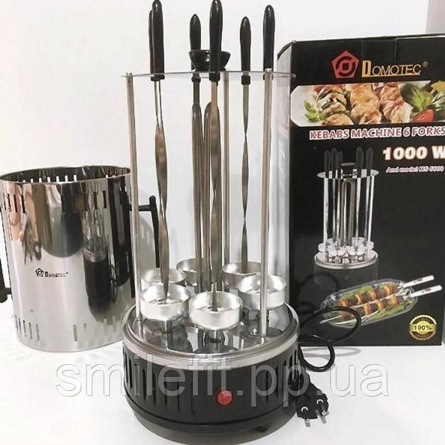 Модель електрошашличниці BBQ від ТМ Domotec відрізняється циліндричною формою, у верхній частині якої розміщується жарова камера, з нижньою – привід шампурів. Завдяки шести шампура, що обертаються, з чашами для стікання жиру і закритого кожуха забезпечується рівномірне прожарювання з усіх боків.