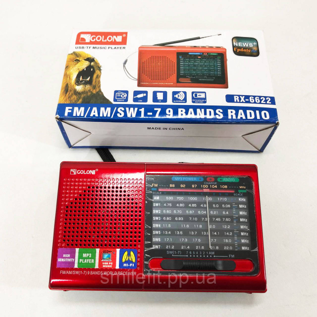 Частотний діапазон: FM 88-108 MHz, SW (1-7) 4.75-22 MHz, AM 530-1710 KHz;