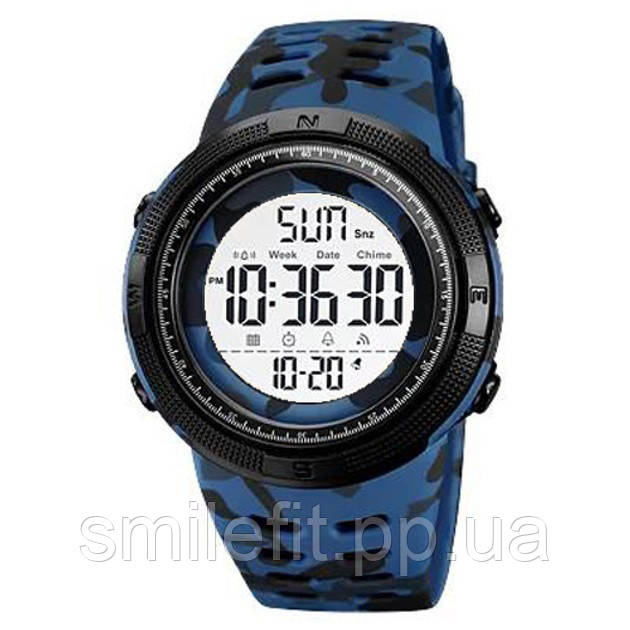 SKMEI 2070CMBUWT — це спортивний електронний годинник, який вирізняється не лише широким функціоналом, а й яскравим зовнішнім виглядом. Камуфляжний ремінець у синьо-чорному кольорі додає динаміки та сміливості, а великий круглий дисплей з чіткими цифрами дозволяє легко зчитувати інформацію навіть на ходу. Модель створена для активного способу життя, спорту та щоденного використання.