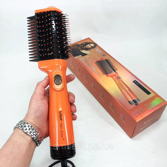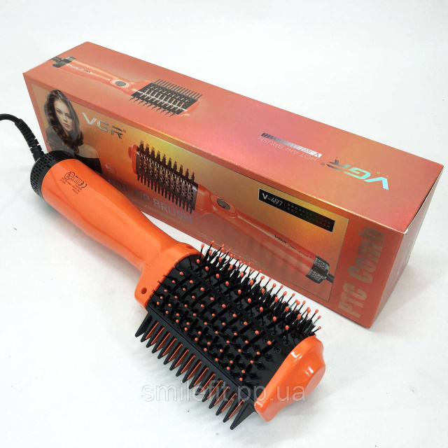 Фен-щітка для волосся VGR V-497– пристрій, який може замінити одночасно плойку, праску та фен. Він може використовуватися для сушіння волосся та моделювання зачісок, вирівнювання пасм та створення ефектних укладок. Мультистайлер має поворотну насадку з керамічним покриттям, завдяки чому виключено перегрів та пошкодження локонів.