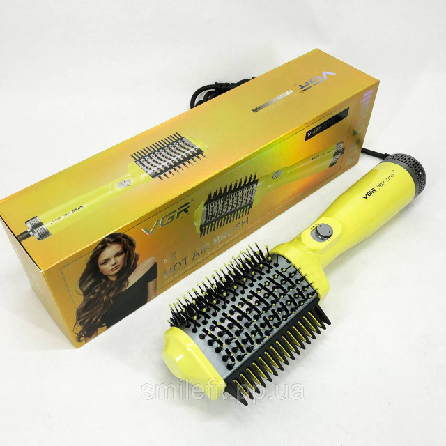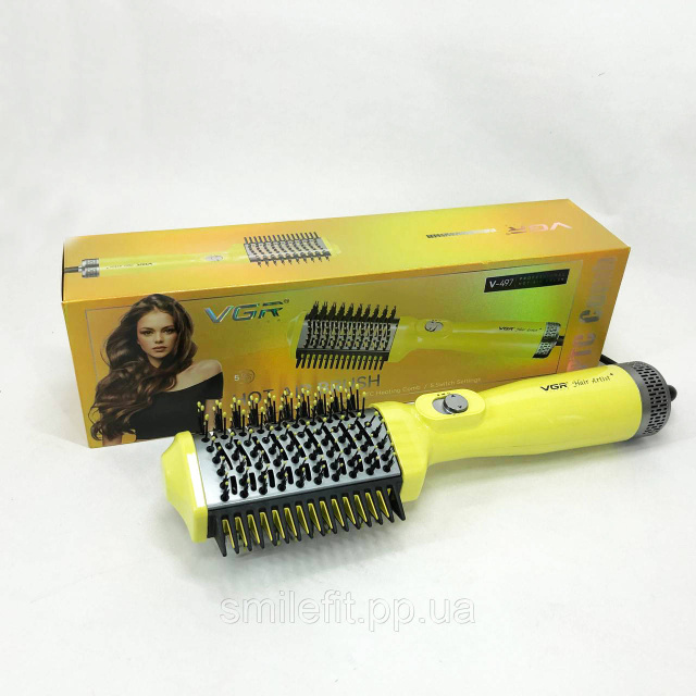 Фен-щітка для волосся VGR V-497– пристрій, який може замінити одночасно плойку, праску та фен. Він може використовуватися для сушіння волосся та моделювання зачісок, вирівнювання пасм та створення ефектних укладок. Мультистайлер має поворотну насадку з керамічним покриттям, завдяки чому виключено перегрів та пошкодження локонів.