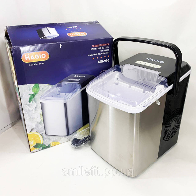Кригогенератор Magio (MG-990) являє собою компактний пристрій, здатний виробляти до 12 кг льоду на добу. Він оснащений електричним механізмом заморожування води, що дозволяє швидко формувати кубики льоду різного розміру. Пристрій оснащений інтуїтивно зрозумілим панельним керуванням та автоматичним вимкненням при наповненні контейнера. Льодогенератор Magio (MG-990) ідеально підходить для домашнього використання або в малих закладах громадського харчування, де потрібне регулярне забезпечення льодом.