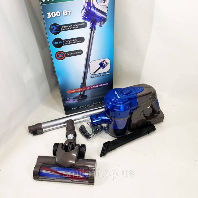 Комплектація: Корпус приладу, Алюмінієва труба, Блок акумуляторної батареї ,Зарядний адаптер, Щітка для підлоги ,Комбінована щітка, Настінний тримач