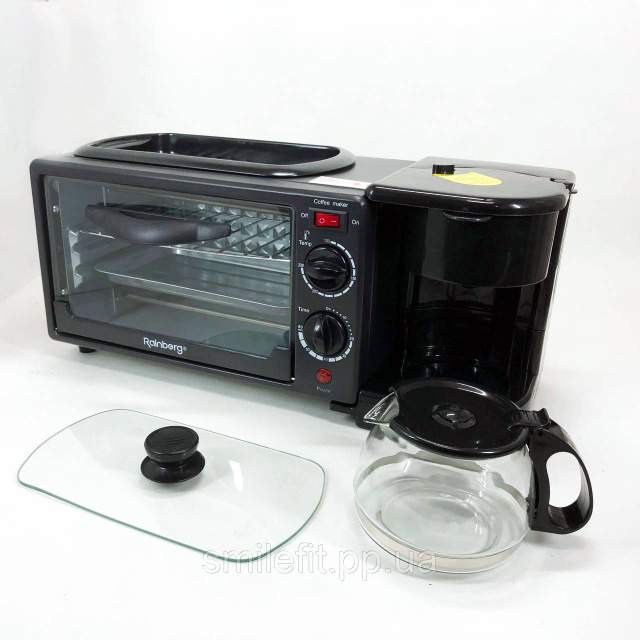 Електрична піч настільна для кухні для випікання з кавоваркою і сковородою гриль із кришкою 3в1 (машина для сніданку) Rainberg RB 2286B 3800 Вт – це дивовижний маленький багатофункціональний кухонний прилад, що може приготувати до 6 чашок кави, і навіть використовуватися для приготування на сковороді!