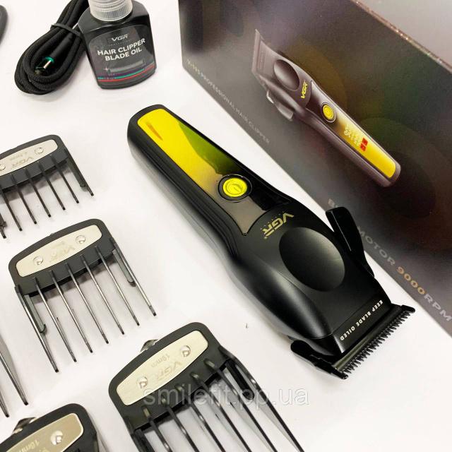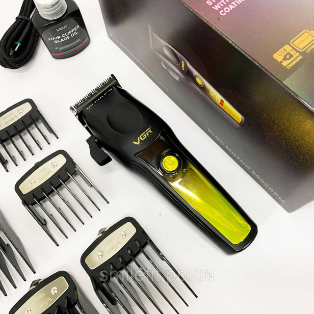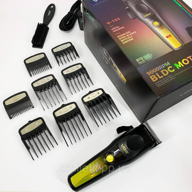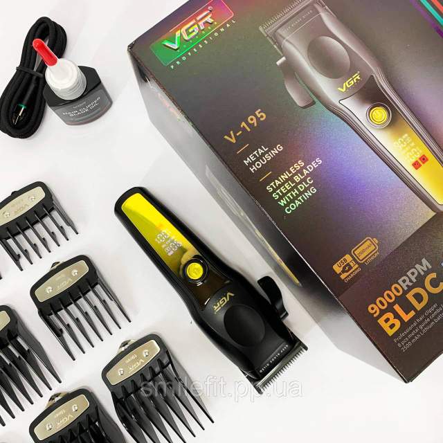 У комплект входять 8 знімних насадок, що дозволяють точно регулювати довжину зрізу для створення різних стилів — від акуратного окантування до повноцінної стрижки. Інтуїтивно зрозумілий LED-дисплей інформує про поточний рівень заряду, необхідність мастила, режим роботи та стан зарядки. Бездротовий формат забезпечує свободу рухів, а висока продуктивність, надійність та універсальність роблять VGR V-195 GREEN чудовим вибором як для професіоналів, так і для особистого догляду.