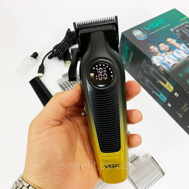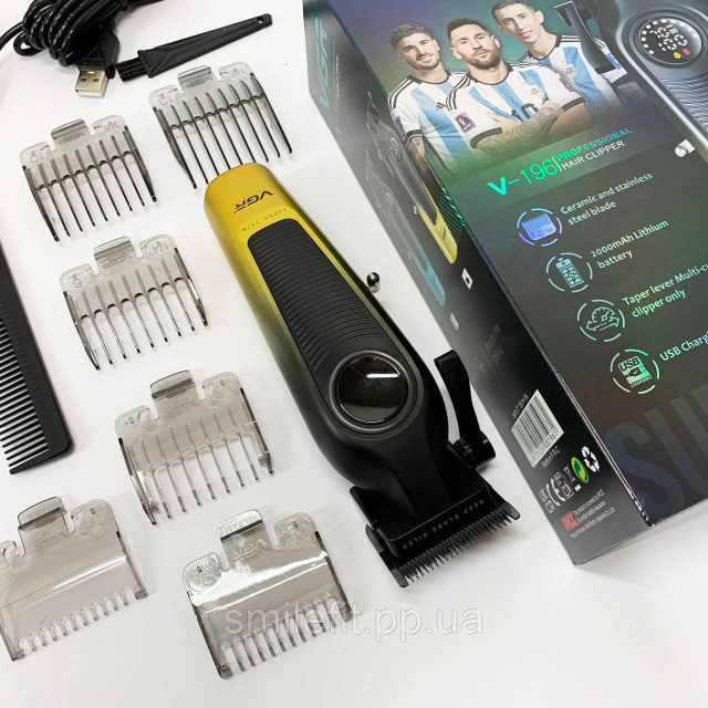 У комплект входять 6 насадок, що дозволяють точно налаштовувати довжину зрізу від 1.5 до 13 мм для створення різних стилів та форм. LED-дисплей відображає заряд акумулятора, режим роботи, нагадування про необхідність мастила та інші важливі параметри, забезпечуючи зручність та контроль у процесі використання. Бездротова конструкція дає повну свободу рухів, а висока продуктивність та універсальність роблять VGR V-196 ідеальним інструментом для тих, хто цінує якість, функціональність та стиль.