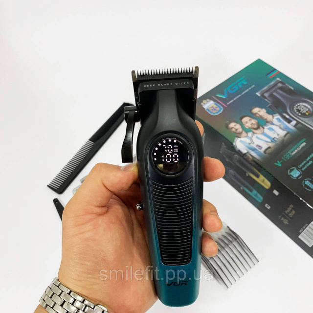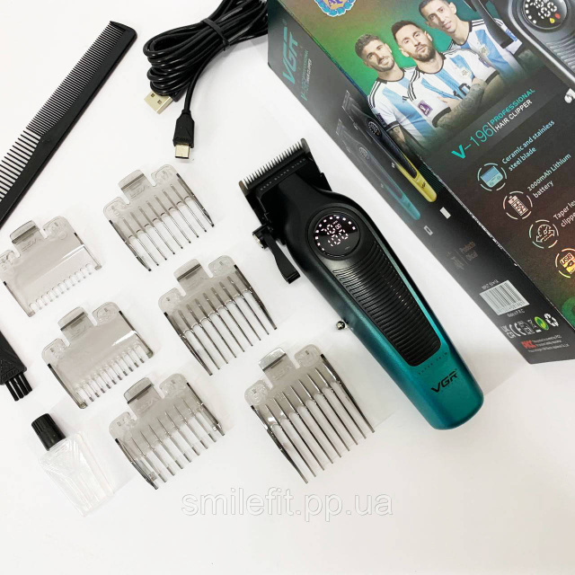 У комплект входять 6 насадок, що дозволяють точно налаштовувати довжину зрізу від 1.5 до 13 мм для створення різних стилів та форм. LED-дисплей відображає заряд акумулятора, режим роботи, нагадування про необхідність мастила та інші важливі параметри, забезпечуючи зручність та контроль у процесі використання. Бездротова конструкція дає повну свободу рухів, а висока продуктивність та універсальність роблять VGR V-196 ідеальним інструментом для тих, хто цінує якість, функціональність та стиль.