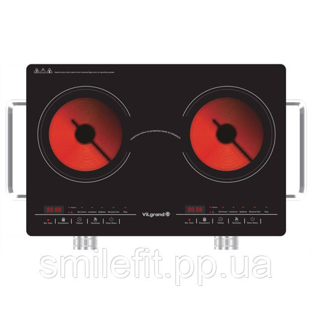 Плитка ViLgrandVHP2052FR має 2 інфрачервоні конфорки вражаючою потужністю 2000 Вт кожна. Інфрачервоний (пірокерамічний) нагрівальний елемент практично миттєво видає необхідну температуру та невибагливий у догляді. Плита має сенсорне керування під цільною платформою із загартованого скла зі світловим індикатором, за допомогою якого можна легко вибрати бажаний рівень потужності або вибрати одну з 5 програм. Корпус з нержавіючої сталі із зручними ручками та з робочою поверхнею із загартованого скла. Воно стійке до подряпин, деформації, а також його дуже просто очистити від забруднень.